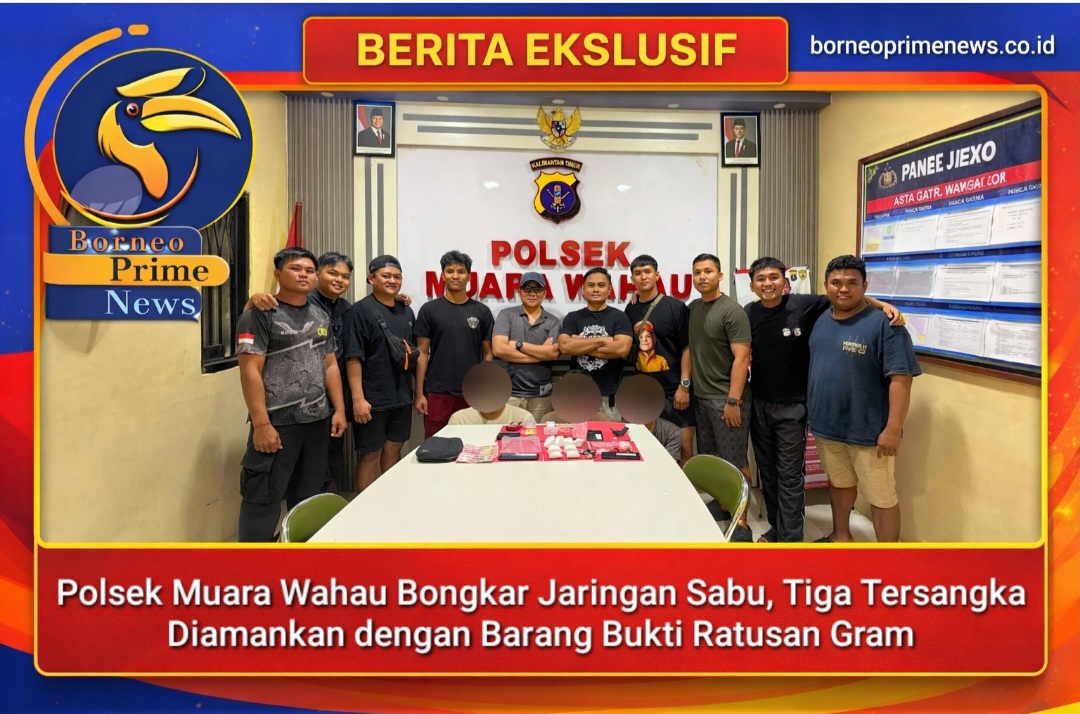 KUTAI TIMUR, borneprimenews.co.id – Jajaran Polsek Muara Wahau berhasil mengungkap rangkaian kasus tindak pidana narkotika dalam operasi pengembangan beruntun pada Minggu, 22 Februari 2026. Tiga tersangka berhasil diamankan dari beberapa lokasi berbeda, dengan total barang bukti diduga sabu mencapai ratusan gram.