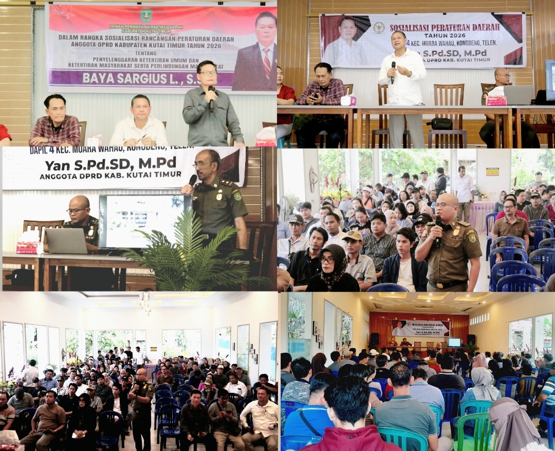 KUTAI TIMUR, borneoprimenews.co.id — Anggota DPRD Kabupaten Kutai Timur dari Daerah Pemilihan (Dapil) 4 menggelar kegiatan sosialisasi Rancangan Peraturan Daerah (Perda) Tahun 2026 tentang penyelenggaraan ketertiban umum, ketenteraman masyarakat, serta perlindungan masyarakat, pada Minggu (22/02/2026).